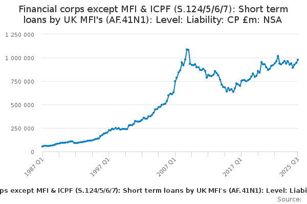 Download this time seriesFinancial corps except MFI & ICPF (S.124/5/6/7): Short term loans by UK MFI's (AF.41N1): Level: Liability: CP £m: NSA