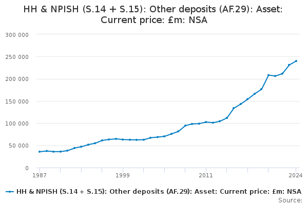 Download this time seriesHH & NPISH (S.14 + S.15): Other deposits (AF.29): Asset: Current price: £m: NSA