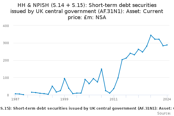 Download this time seriesHH & NPISH (S.14 + S.15): Short-term debt securities issued by UK central government (AF.31N1): Asset: Current price: £m: NSA