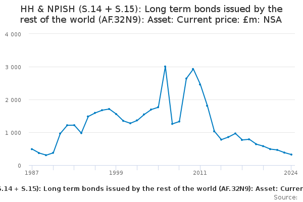 Download this time seriesHH & NPISH (S.14 + S.15): Long term bonds issued by the rest of the world (AF.32N9): Asset: Current price: £m: NSA