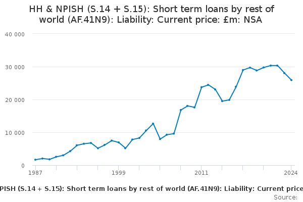 Download this time seriesHH & NPISH (S.14 + S.15): Short term loans by rest of world (AF.41N9): Liability: Current price: £m: NSA