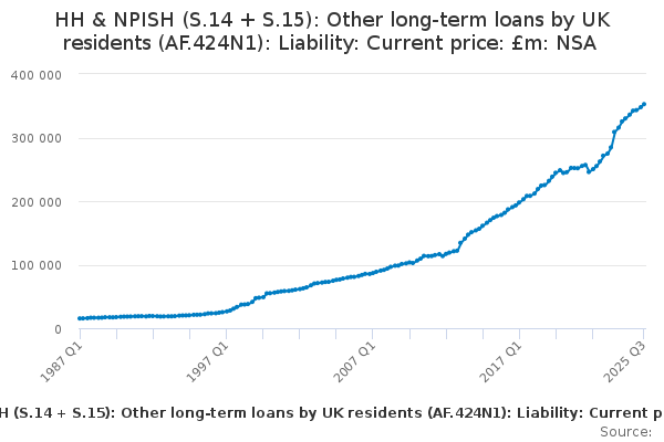 Download this time seriesHH & NPISH (S.14 + S.15): Other long-term loans by UK residents (AF.424N1): Liability: Current price: £m: NSA