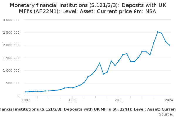Download this time seriesMonetary financial institutions (S.121/2/3): Deposits with UK MFI's (AF.22N1): Level: Asset: Current price £m: NSA