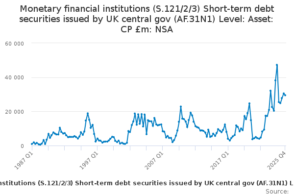 Download this time seriesMonetary financial institutions (S.121/2/3) Short-term debt securities issued by UK central gov (AF.31N1) Level: Asset: CP £m: NSA