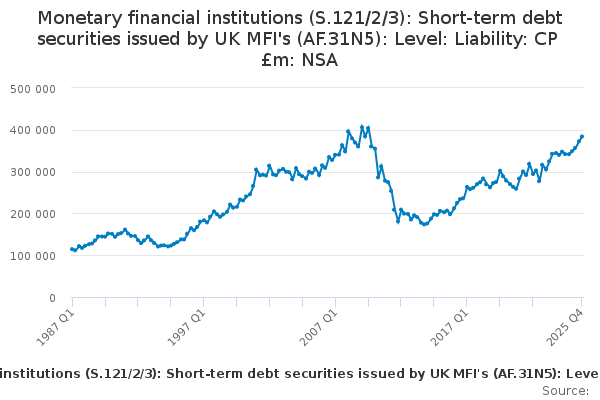 Download this time seriesMonetary financial institutions (S.121/2/3): Short-term debt securities issued by UK MFI's (AF.31N5): Level: Liability: CP £m: NSA