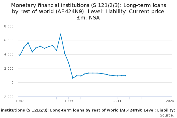 Download this time seriesMonetary financial institutions (S.121/2/3): Long-term loans by rest of world (AF.424N9): Level: Liability: Current price £m: NSA