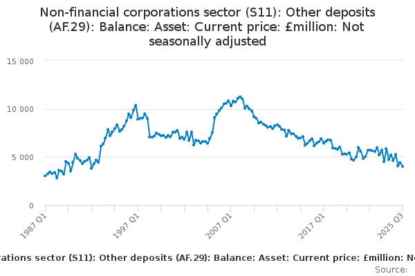 Download this time seriesNon-financial corporations sector (S11): Other deposits (AF.29): Balance: Asset: Current price: £million: Not seasonally adjusted