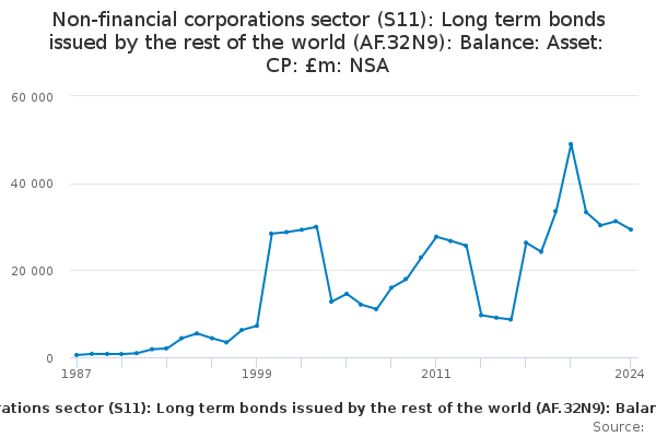 Download this time seriesNon-financial corporations sector (S11): Long term bonds issued by the rest of the world (AF.32N9): Balance: Asset: CP: £m: NSA