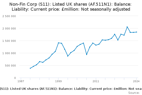 Download this time seriesNon-Fin Corp (S11): Listed UK shares (AF.511N1): Balance: Liability: Current price: £million: Not seasonally adjusted