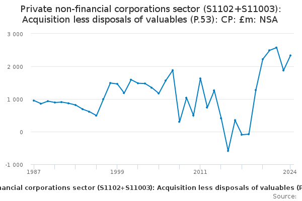 Download this time seriesPrivate non-financial corporations sector (S1102+S11003): Acquisition less disposals of valuables (P.53): CP: £m: NSA