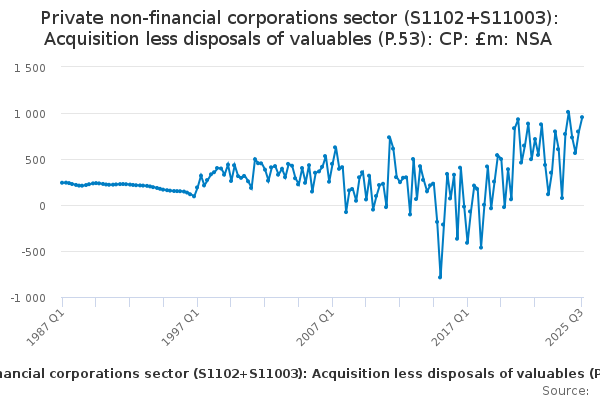 Download this time seriesPrivate non-financial corporations sector (S1102+S11003): Acquisition less disposals of valuables (P.53): CP: £m: NSA