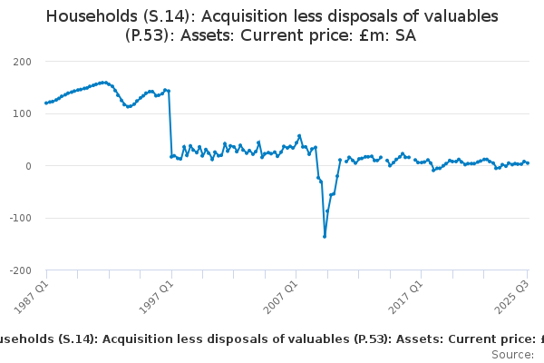 Download this time seriesHouseholds (S.14): Acquisition less disposals of valuables (P.53): Assets: Current price: £m: SA