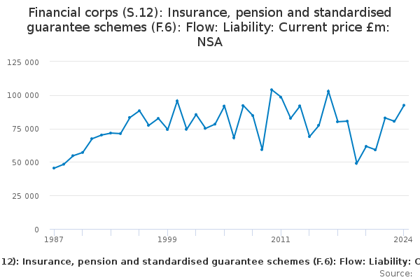 Download this time seriesFinancial corps (S.12): Insurance, pension and standardised guarantee schemes (F.6): Flow: Liability: Current price £m: NSA