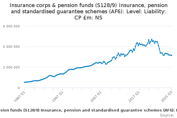 Download this time seriesInsurance corps & pension funds (S128/9) Insurance, pension and standardised guarantee schemes (AF6): Level: Liability: CP £m: NS