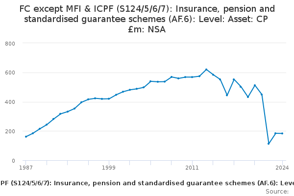 Download this time seriesFC except MFI & ICPF (S124/5/6/7): Insurance, pension and standardised guarantee schemes (AF.6): Level: Asset: CP £m: NSA