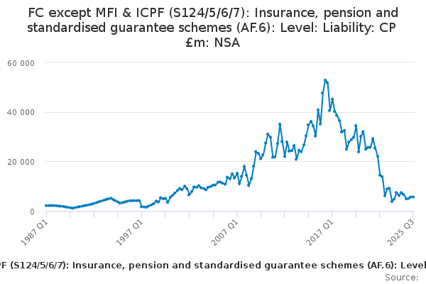Download this time seriesFC except MFI & ICPF (S124/5/6/7): Insurance, pension and standardised guarantee schemes (AF.6): Level: Liability: CP £m: NSA
