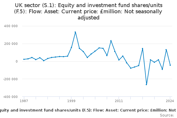 Download this time seriesUK sector (S.1): Equity and investment fund shares/units (F.5): Flow: Asset: Current price: £million: Not seasonally adjusted