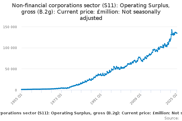 Download this time seriesNon-financial corporations sector (S11): Operating Surplus, gross (B.2g): Current price: £million: Not seasonally adjusted