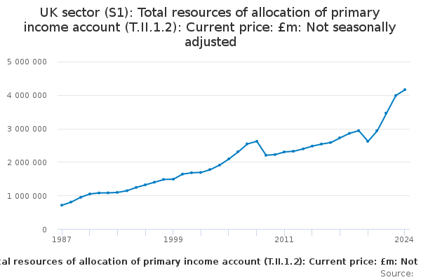 Download this time seriesUK sector (S1): Total resources of allocation of primary income account (T.II.1.2): Current price: £m: Not seasonally adjusted