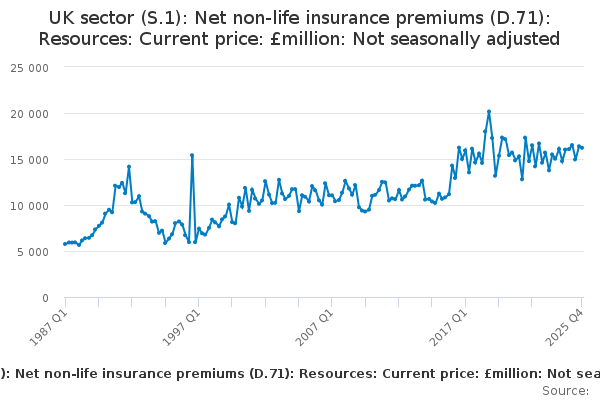 Download this time seriesUK sector (S.1): Net non-life insurance premiums (D.71): Resources: Current price: £million: Not seasonally adjusted