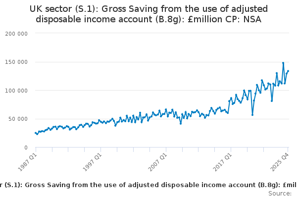Download this time seriesUK sector (S.1): Gross Saving from the use of adjusted disposable income account (B.8g): £million CP: NSA