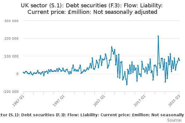 Download this time seriesUK sector (S.1): Debt securities (F.3): Flow: Liability: Current price: £million: Not seasonally adjusted