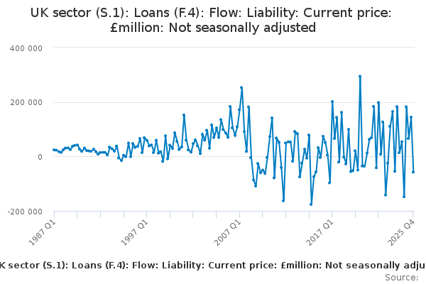 Download this time seriesUK sector (S.1): Loans (F.4): Flow: Liability: Current price: £million: Not seasonally adjusted