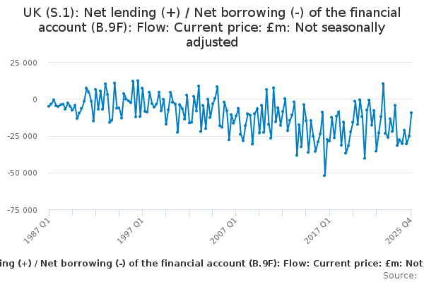 Download this time seriesUK (S.1): Net lending (+) / Net borrowing (-) of the financial account (B.9F): Flow: Current price: £m: Not seasonally adjusted