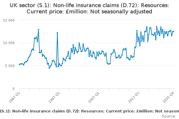 Download this time seriesUK sector (S.1): Non-life insurance claims (D.72): Resources: Current price: £million: Not seasonally adjusted