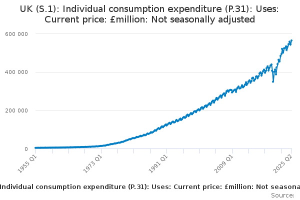 Download this time seriesUK (S.1): Individual consumption expenditure (P.31): Uses: Current price: £million: Not seasonally adjusted