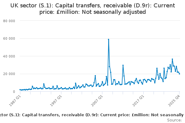 Download this time seriesUK sector (S.1): Capital transfers, receivable (D.9r): Current price: £million: Not seasonally adjusted
