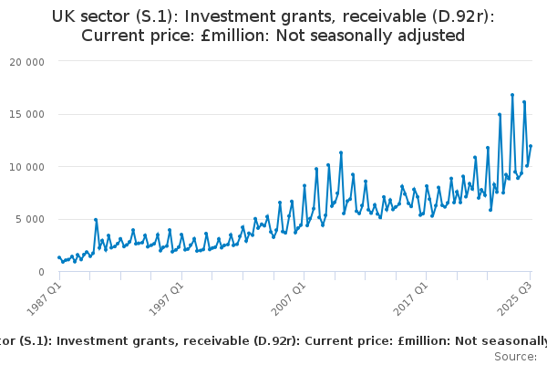 Download this time seriesUK sector (S.1): Investment grants, receivable (D.92r): Current price: £million: Not seasonally adjusted