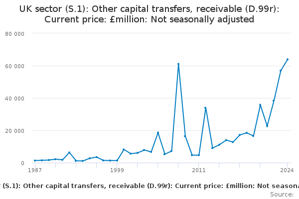 Download this time seriesUK sector (S.1): Other capital transfers, receivable (D.99r): Current price: £million: Not seasonally adjusted