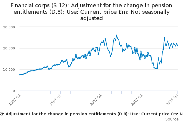 Download this time seriesFinancial corps (S.12): Adjustment for the change in pension entitlements (D.8): Use: Current price £m: Not seasonally adjusted