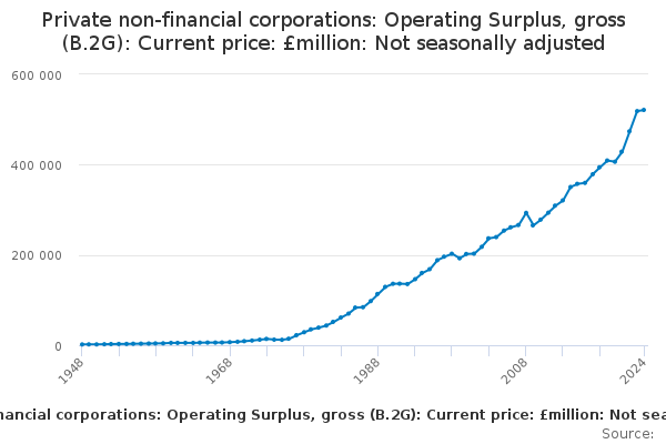 Download this time seriesPrivate non-financial corporations: Operating Surplus, gross (B.2G): Current price: £million: Not seasonally adjusted