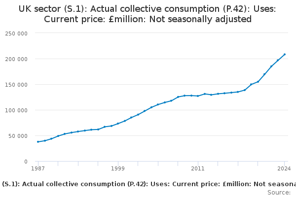 Download this time seriesUK sector (S.1): Actual collective consumption (P.42): Uses: Current price: £million: Not seasonally adjusted