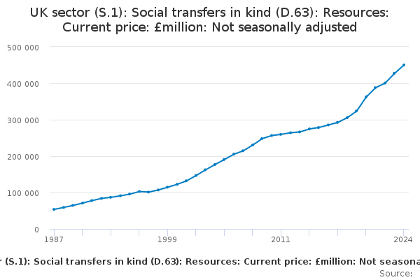 Download this time seriesUK sector (S.1): Social transfers in kind (D.63): Resources: Current price: £million: Not seasonally adjusted