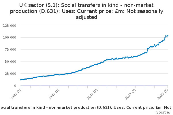 Download this time seriesUK sector (S.1): Social transfers in kind - non-market production (D.631): Uses: Current price: £m: Not seasonally adjusted