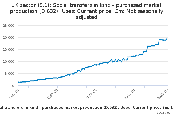 Download this time seriesUK sector (S.1): Social transfers in kind - purchased market production (D.632): Uses: Current price: £m: Not seasonally adjusted