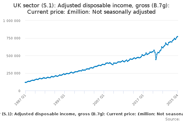 Download this time seriesUK sector (S.1): Adjusted disposable income, gross (B.7g): Current price: £million: Not seasonally adjusted