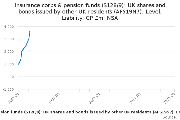 Download this time seriesInsurance corps & pension funds (S128/9): UK shares and bonds issued by other UK residents (AF519N7): Level: Liability: CP £m: NSA