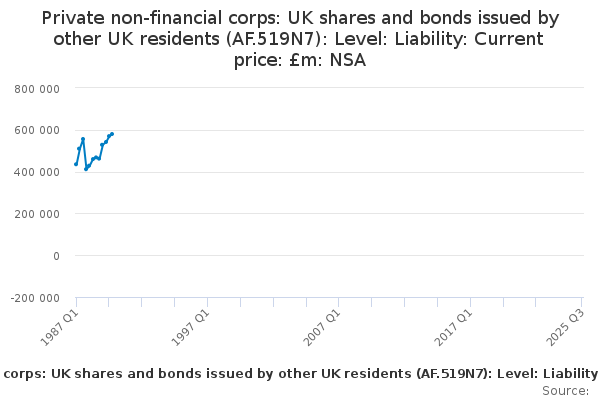 Download this time seriesPrivate non-financial corps: UK shares and bonds issued by other UK residents (AF.519N7): Level: Liability: Current price: £m: NSA