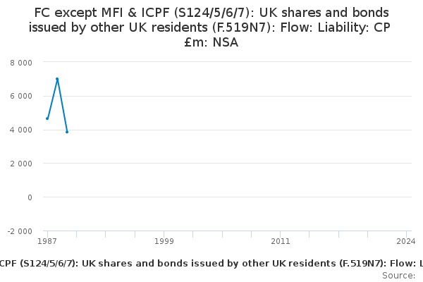 Download this time seriesFC except MFI & ICPF (S124/5/6/7): UK shares and bonds issued by other UK residents (F.519N7): Flow: Liability: CP £m: NSA