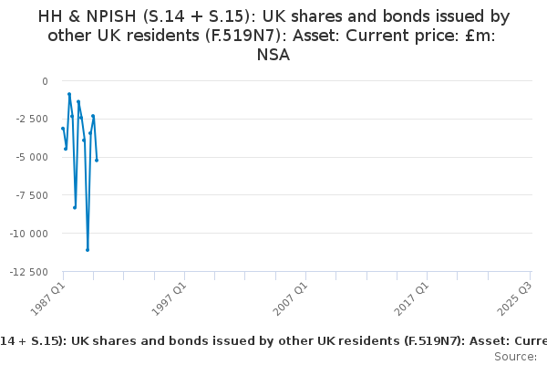 Download this time seriesHH & NPISH (S.14 + S.15): UK shares and bonds issued by other UK residents (F.519N7): Asset: Current price: £m: NSA