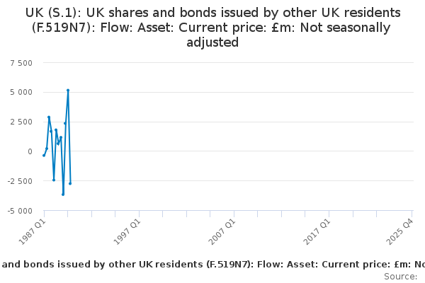 Download this time seriesUK (S.1): UK shares and bonds issued by other UK residents (F.519N7): Flow: Asset: Current price: £m: Not seasonally adjusted