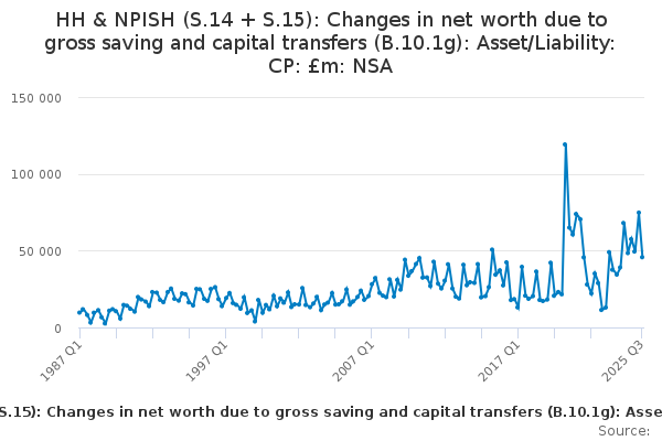 Download this time seriesHH & NPISH (S.14 + S.15): Changes in net worth due to gross saving and capital transfers (B.10.1g): Asset/Liability: CP: £m: NSA