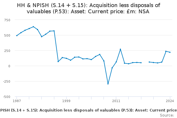 Download this time seriesHH & NPISH (S.14 + S.15): Acquisition less disposals of valuables (P.53): Asset: Current price: £m: NSA