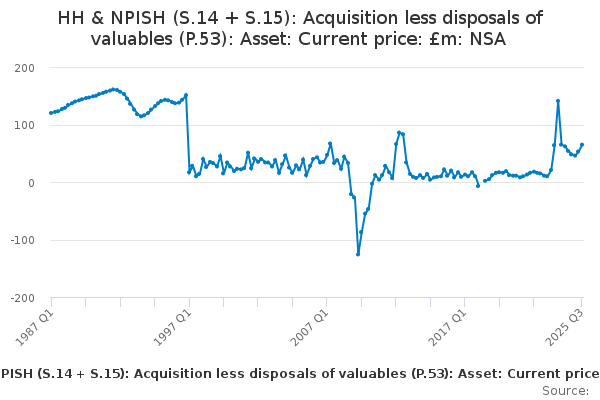 Download this time seriesHH & NPISH (S.14 + S.15): Acquisition less disposals of valuables (P.53): Asset: Current price: £m: NSA
