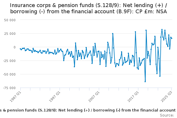 Download this time seriesInsurance corps & pension funds (S.128/9): Net lending (+) / borrowing (-) from the financial account (B.9F): CP £m: NSA