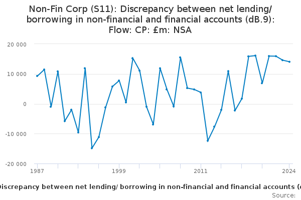 Download this time seriesNon-Fin Corp (S11): Discrepancy between net lending/ borrowing in non-financial and financial accounts (dB.9): Flow: CP: £m: NSA